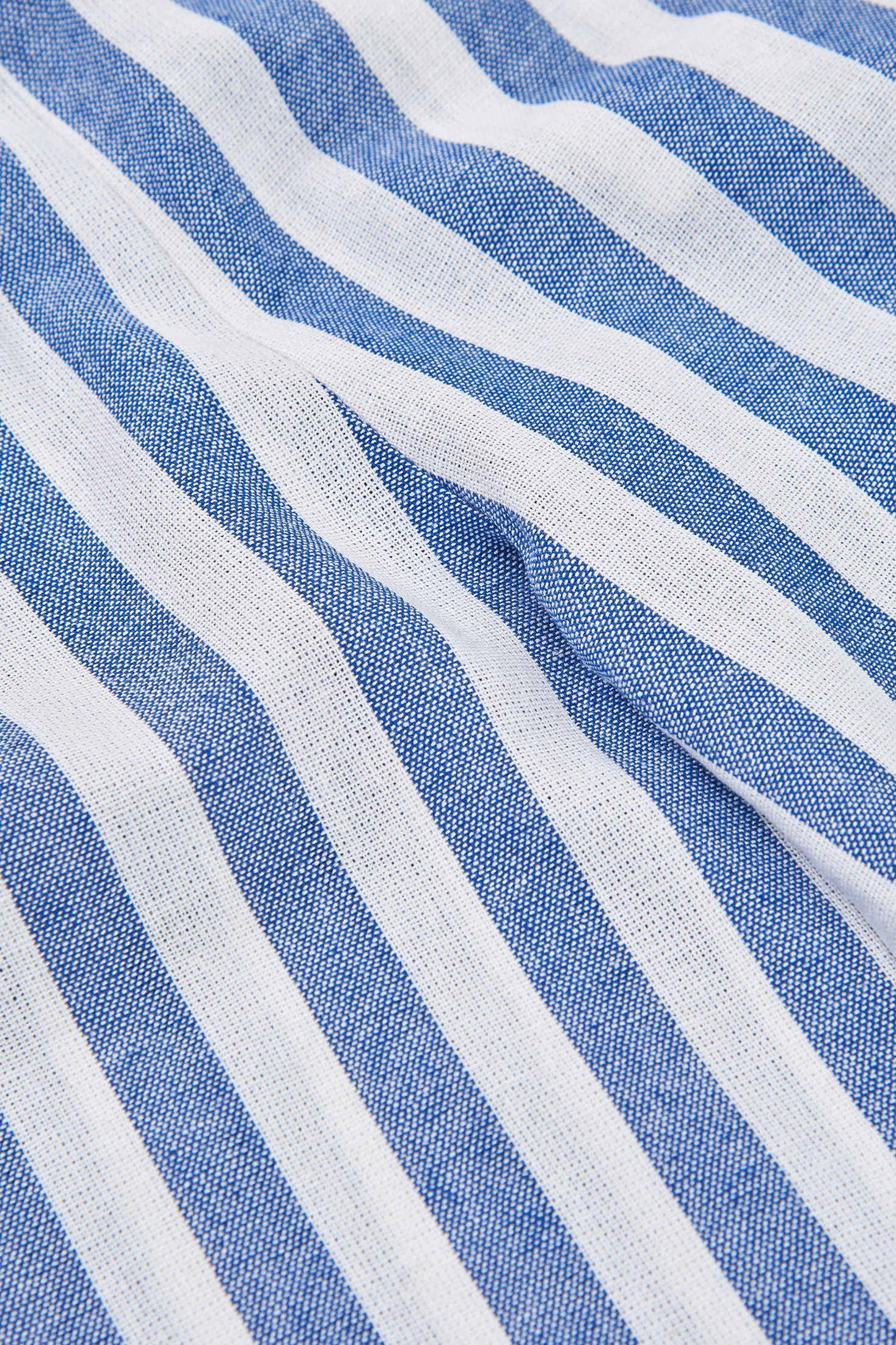 Striped linen trousers for girls offer a fresh and comfortable look. The linen material ensures coolness and lightness, perfect for warm days. They feature a vertical stripe design in blue and white, adding a classic and elegant touch. The adjustable waist provides comfort and a perfect fit. Available in sizes from 12 months to 14 years, they are a versatile option to pair with t-shirts or blouses in light shades for a summer look.