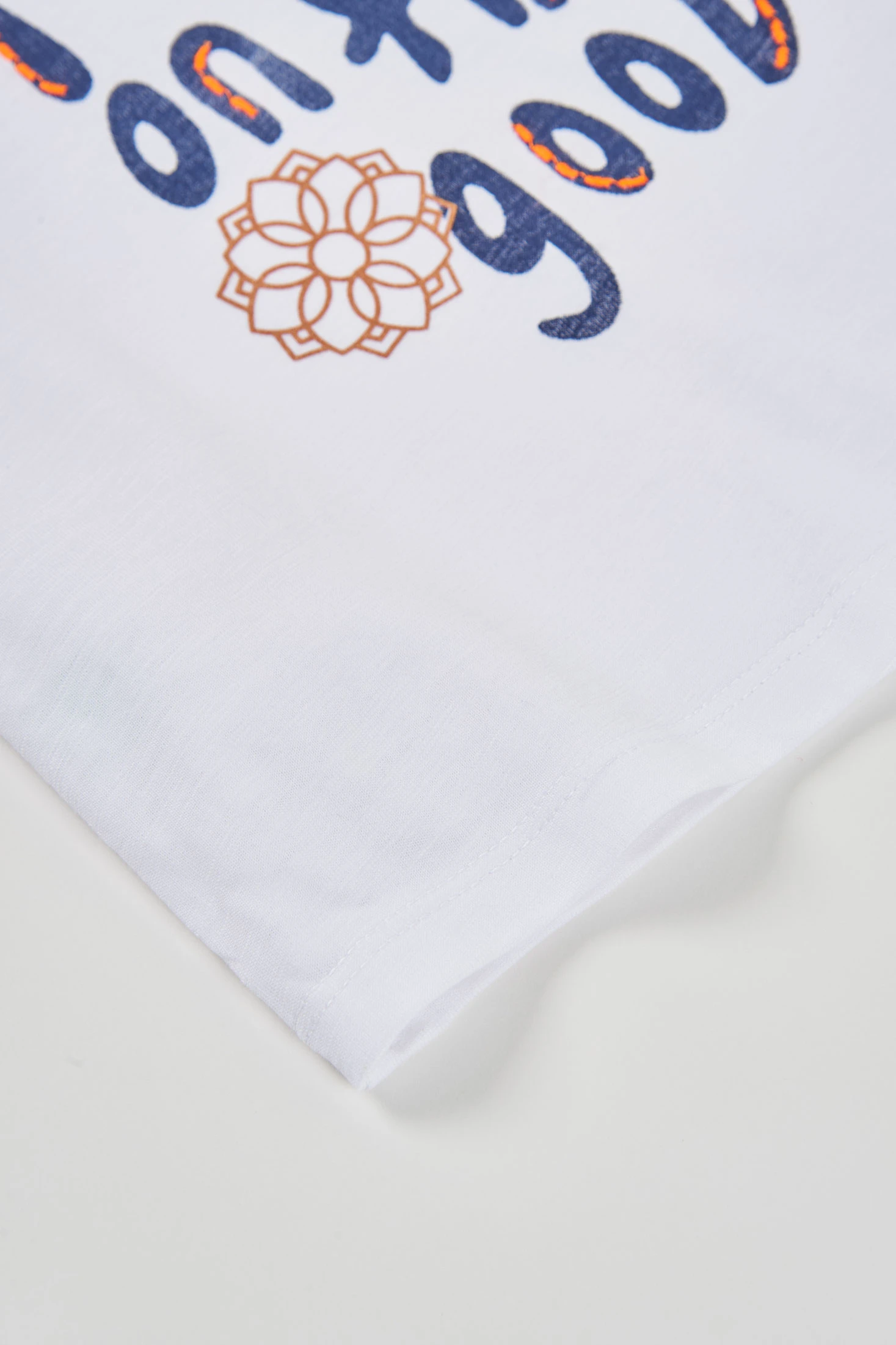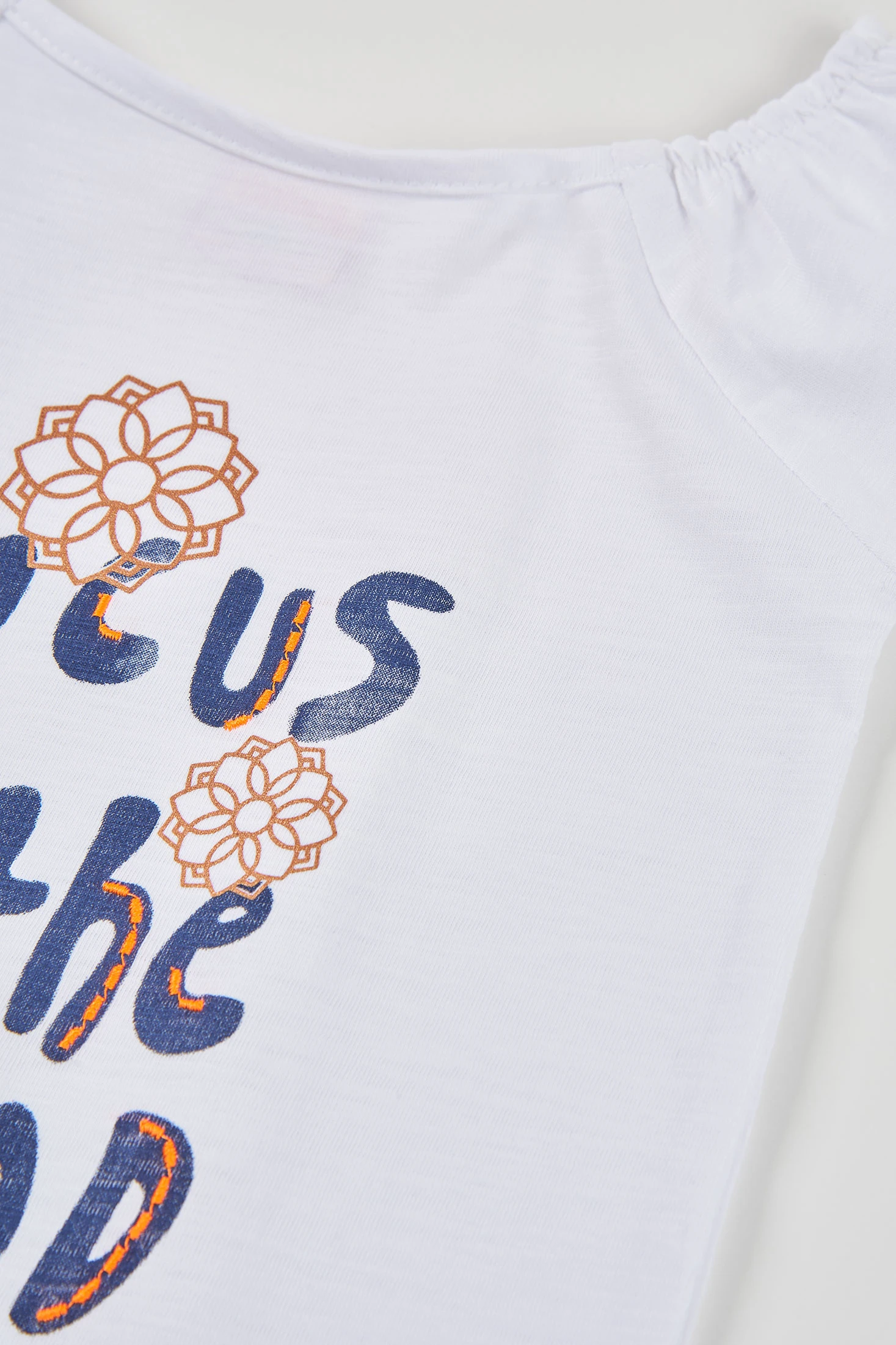 Girls' T-shirt made from white cotton, offering comfort and softness for daily wear. It features a design with the phrase "focus on the good" in printed letters, accompanied by drawings of flowers. Ideal for the summer season with its round neck and short sleeves. Available in sizes from 12 months to 14 years, this versatile garment can be easily paired with brightly coloured trousers or skirts to add a cheerful touch to the outfit.