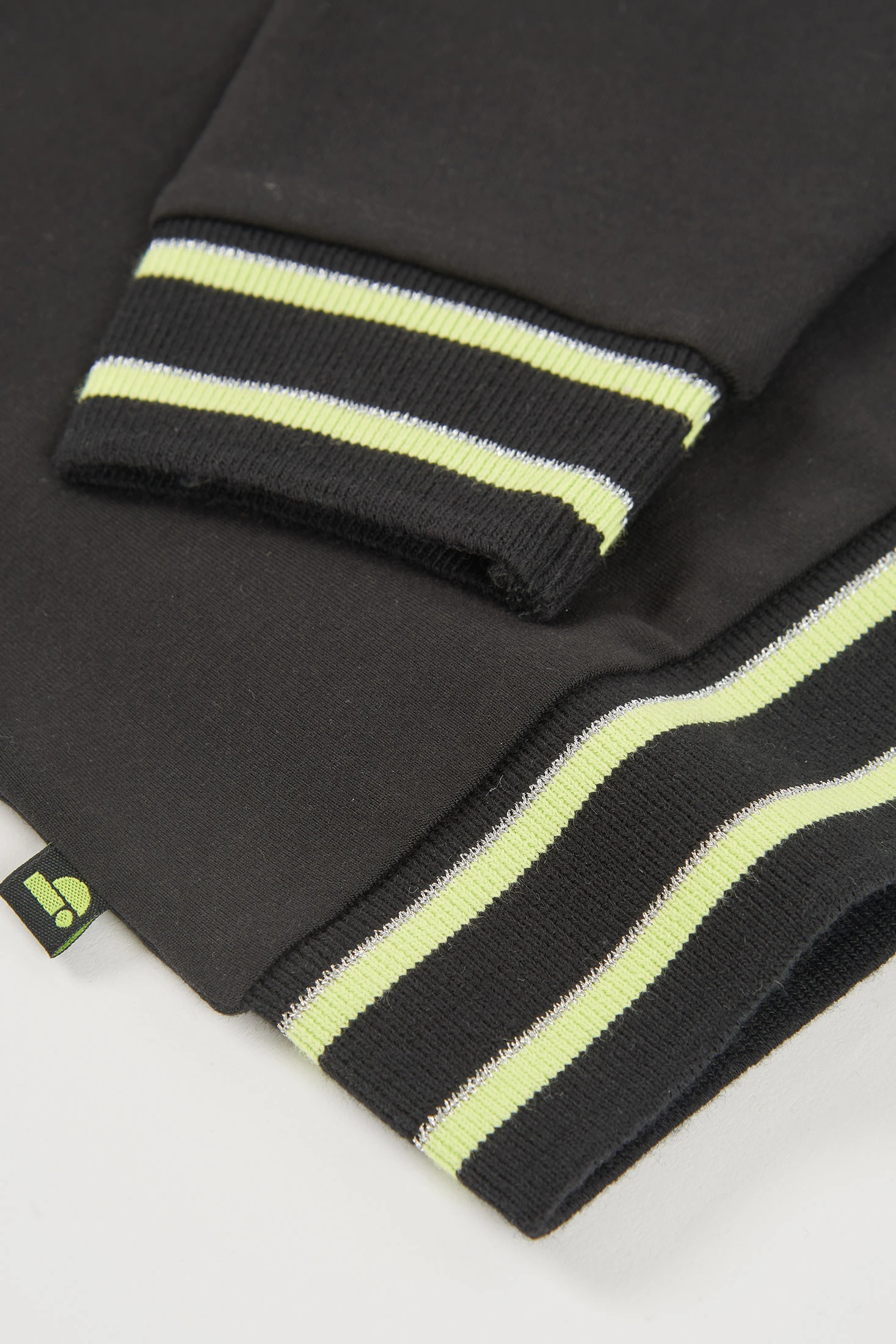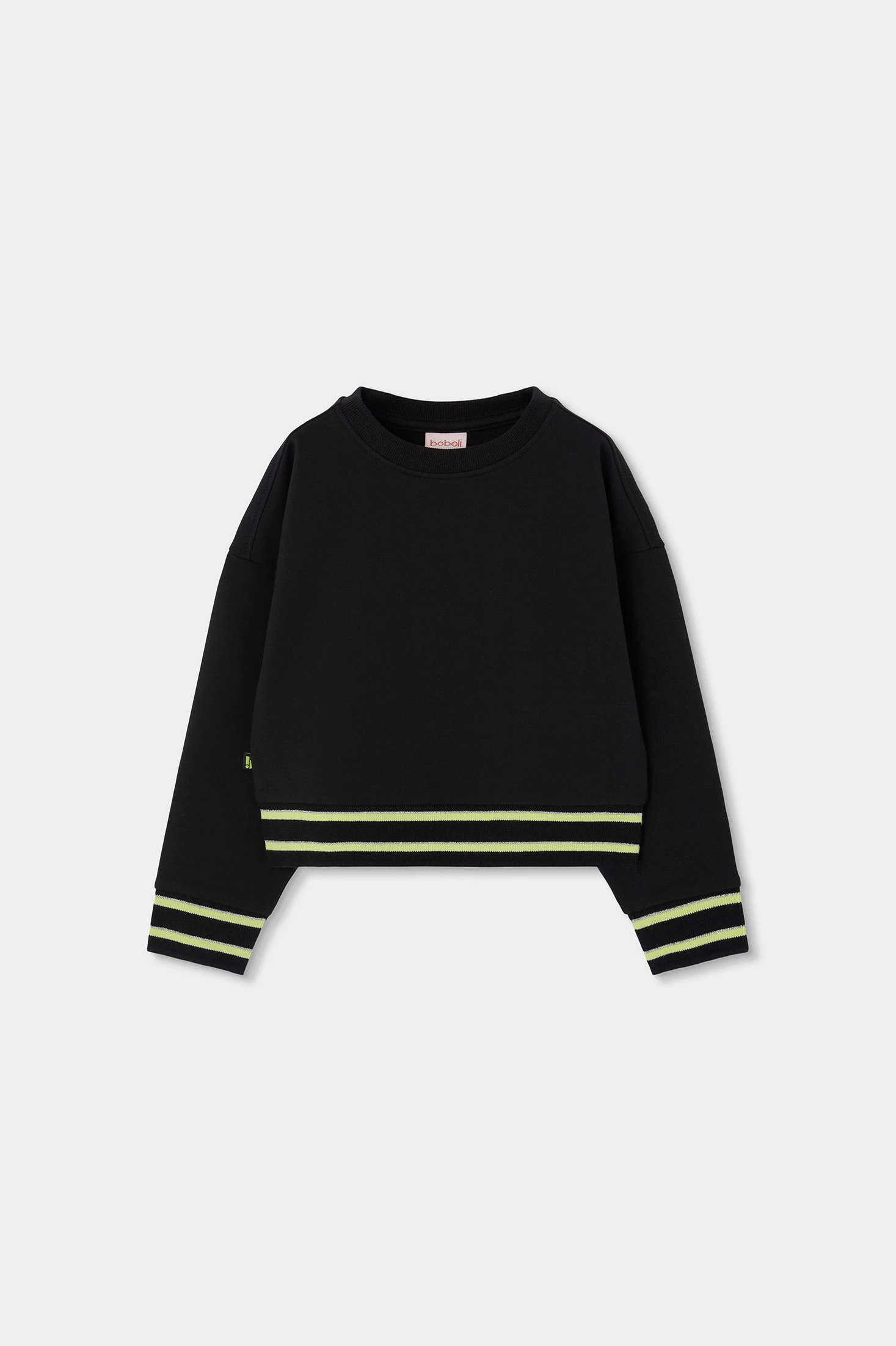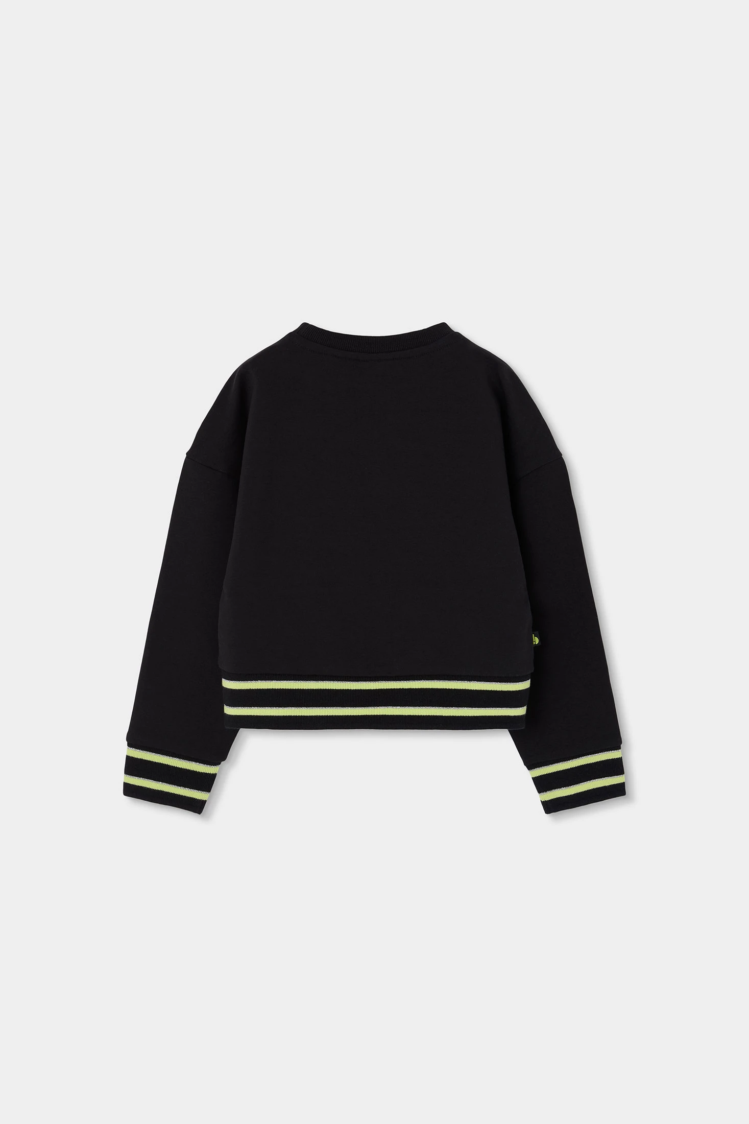 Black fleece sweatshirt for girls, perfect for the cooler days of spring and summer nights. With a simple and elegant design, it features neon green stripes on the ribbed cuffs and hem that add a modern touch. It has a round neck and long sleeves, ideal for a casual and versatile style. Available in sizes from 2 to 14 years, it is a practical choice to pair with different garments and styles.