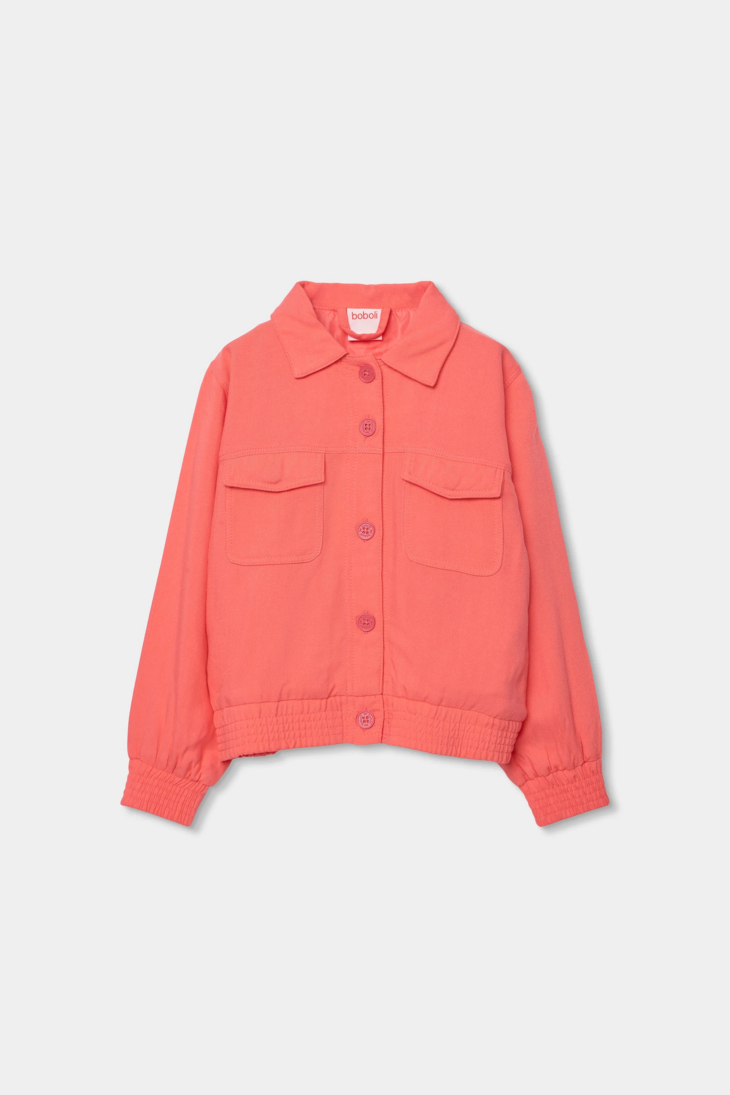 Viscose twill jacket for girls, perfect for the cooler days of spring or summer, crafted in a soft fabric that ensures comfort and warmth. Its strawberry colour design makes it versatile and easy to mix with different styles. Featuring a button closure and functional pockets, it offers practicality and style. Available in sizes from 2 to 14 years, it suits various ages and growth stages. Ideal for completing a casual or elegant look, keeping your girl warm and stylish.