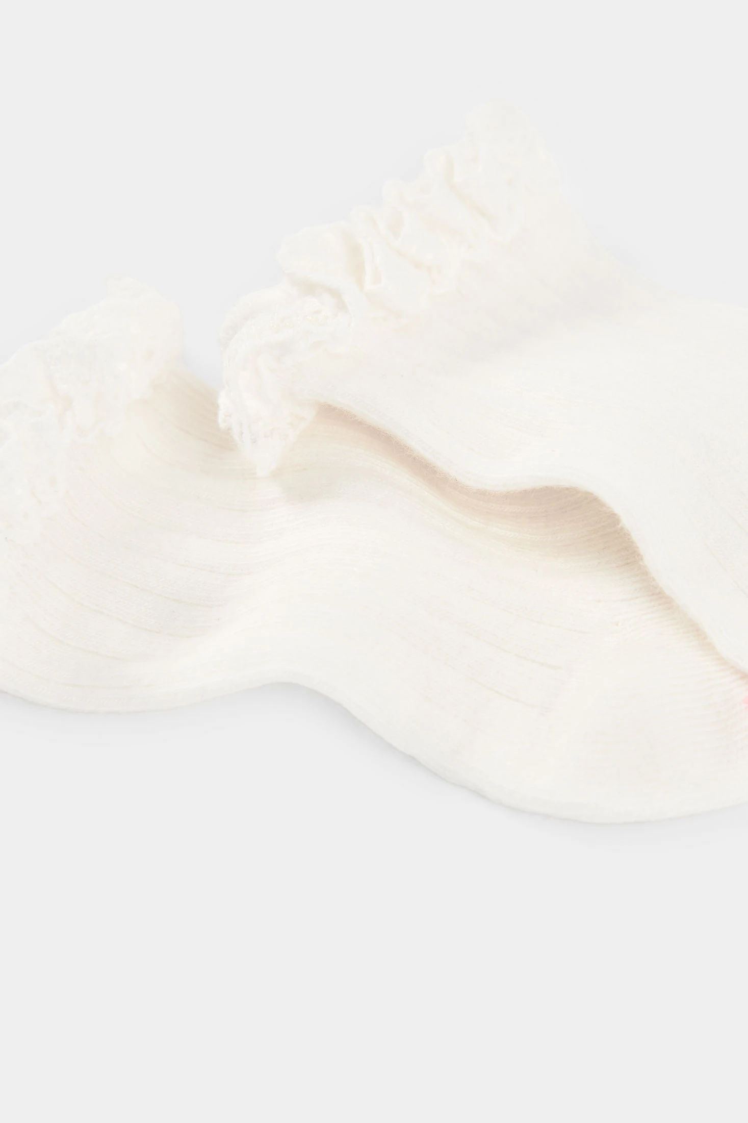 Pack of cotton socks for girls, perfect for keeping feet comfortable and warm. Includes three pairs with different designs and colours: white with blue and pink floral prints, red with floral details, and plain white with frills on the edge. Available in sizes from 19/21 to 37/39, suitable for ages from 12 months to 12 years. Their soft material ensures all-day comfort, making them a practical choice for any occasion.