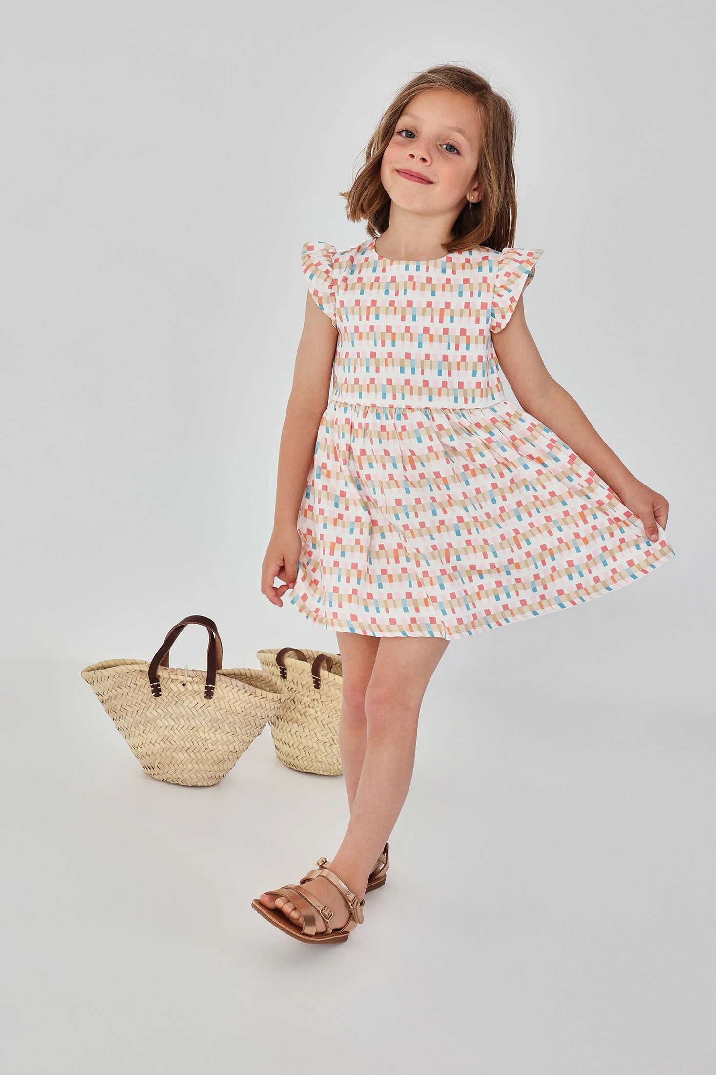 Printed satin dress with borders, perfect for growing girls, offers a delicate and elegant style. Its design features a pastel colour pattern, creating a charming visual effect. Made from satin, it ensures softness and comfort, perfect for special occasions. Sizes are available from 12 months to 10 years, ensuring a suitable fit for different ages. With short sleeves and a slight flare in the skirt, the dress offers a fresh and cheerful look. Ideal for pairing with simple accessories at any event.