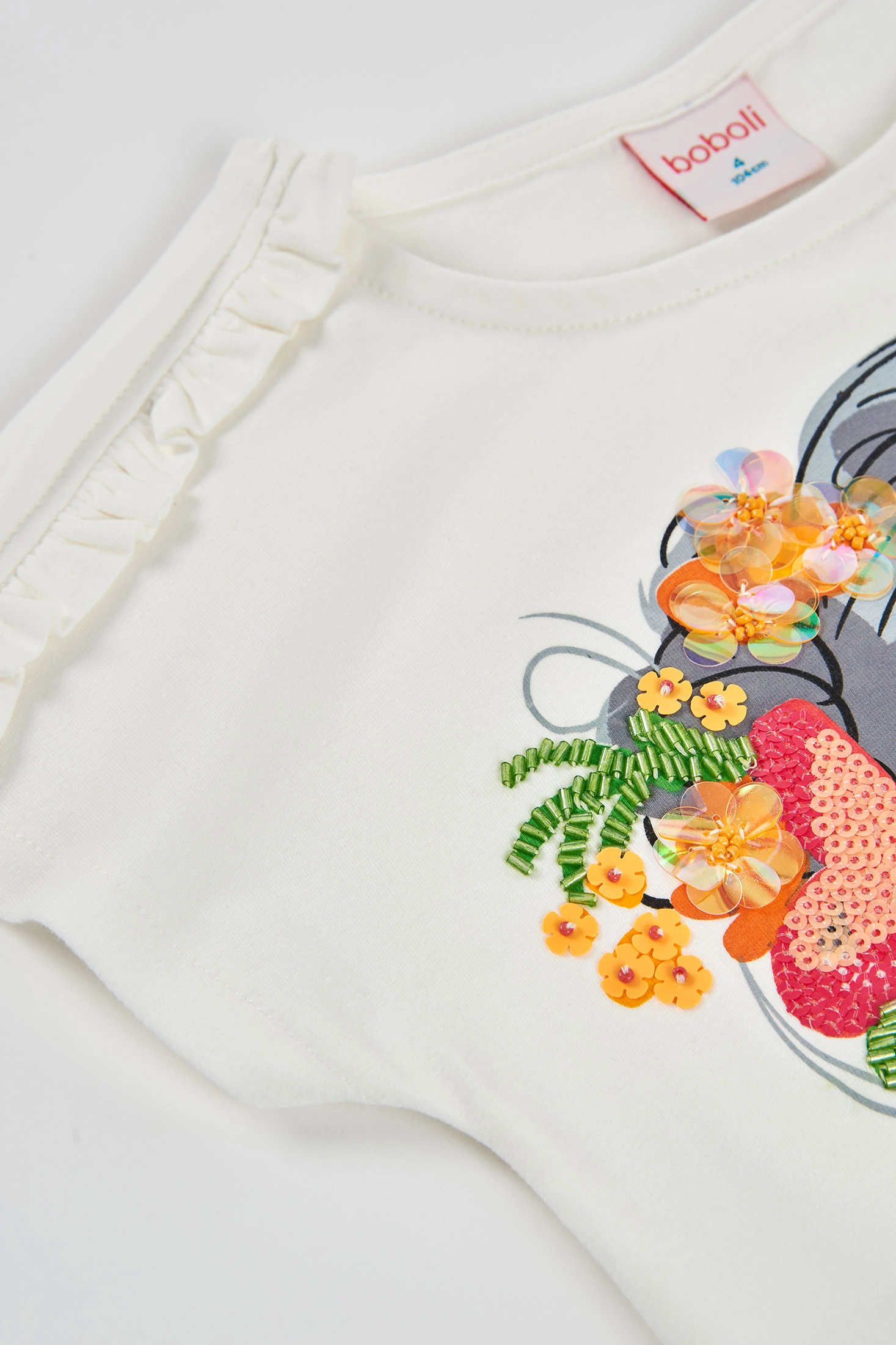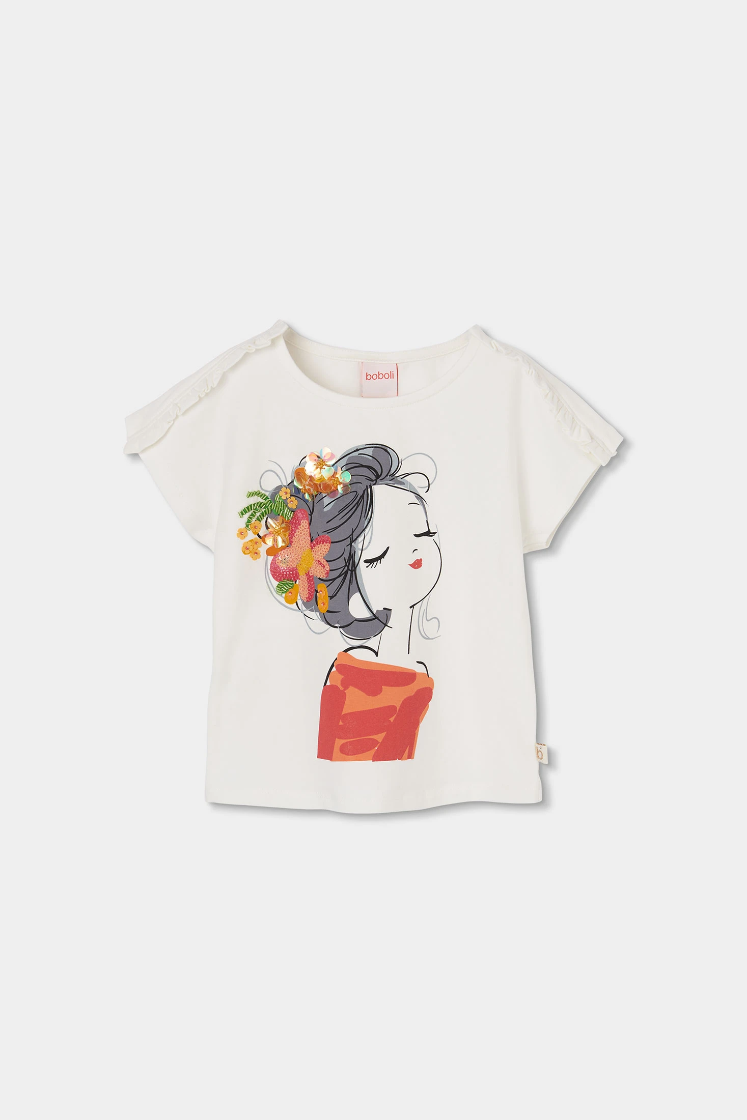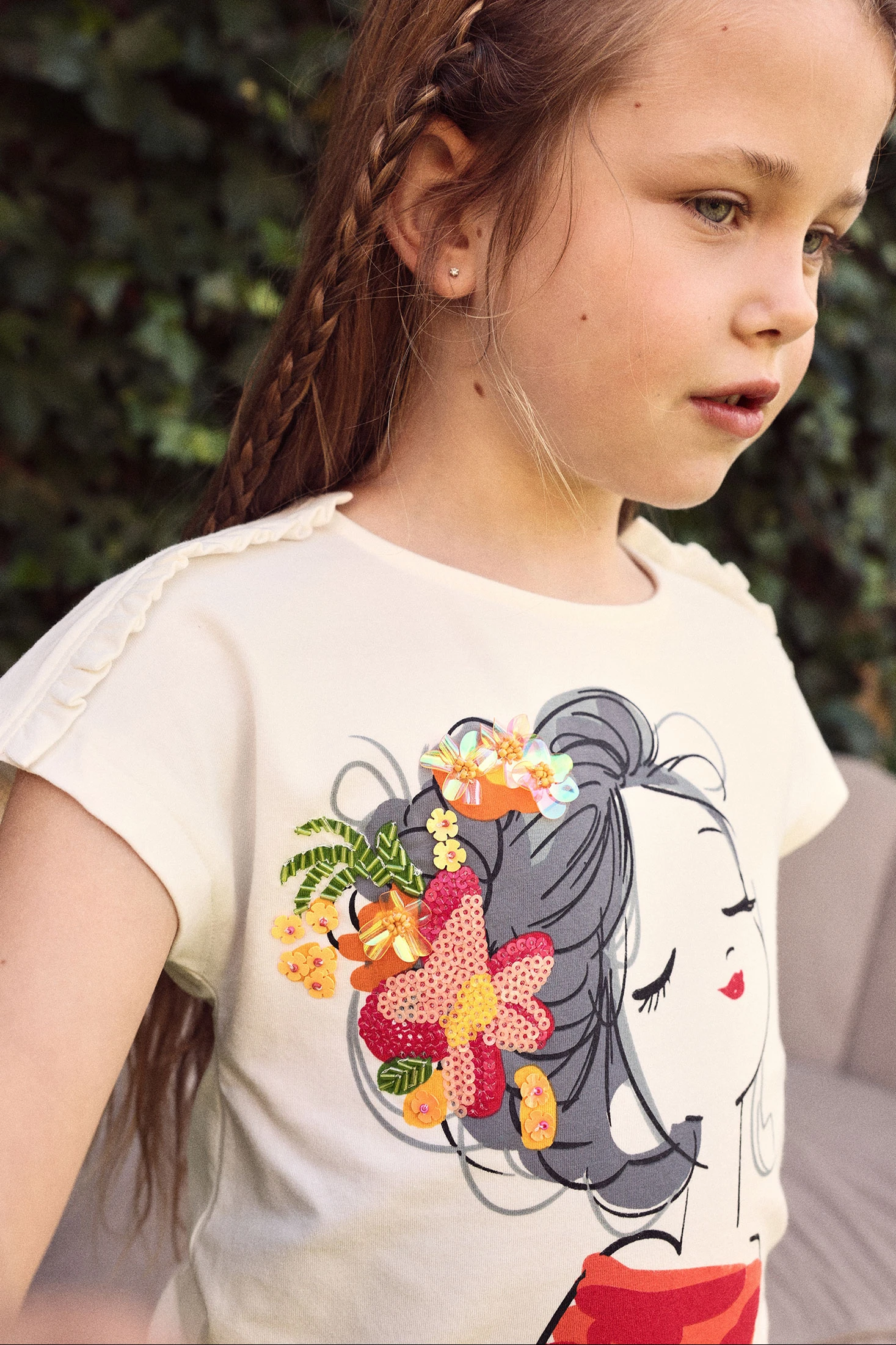 White T-shirt for girls made from a soft knit fabric, ideal for everyday wear. Its design features an eye-catching print of a girl with floral details in her hair, with sewn-on appliqu?s. The T-shirt has a round neckline and short sleeves with delicate ruffles. Available in sizes from 2 years to 14 years, it adapts to different stages of growth. Perfect for pairing with colourful trousers or skirts, adding a touch of style and comfort to any occasion.