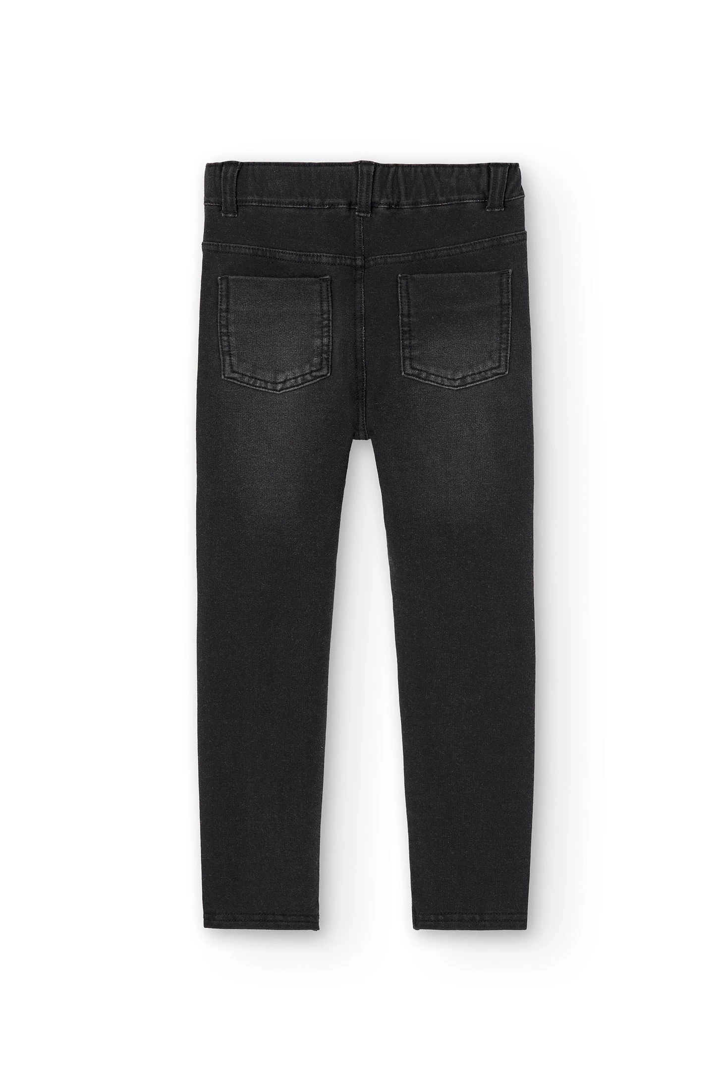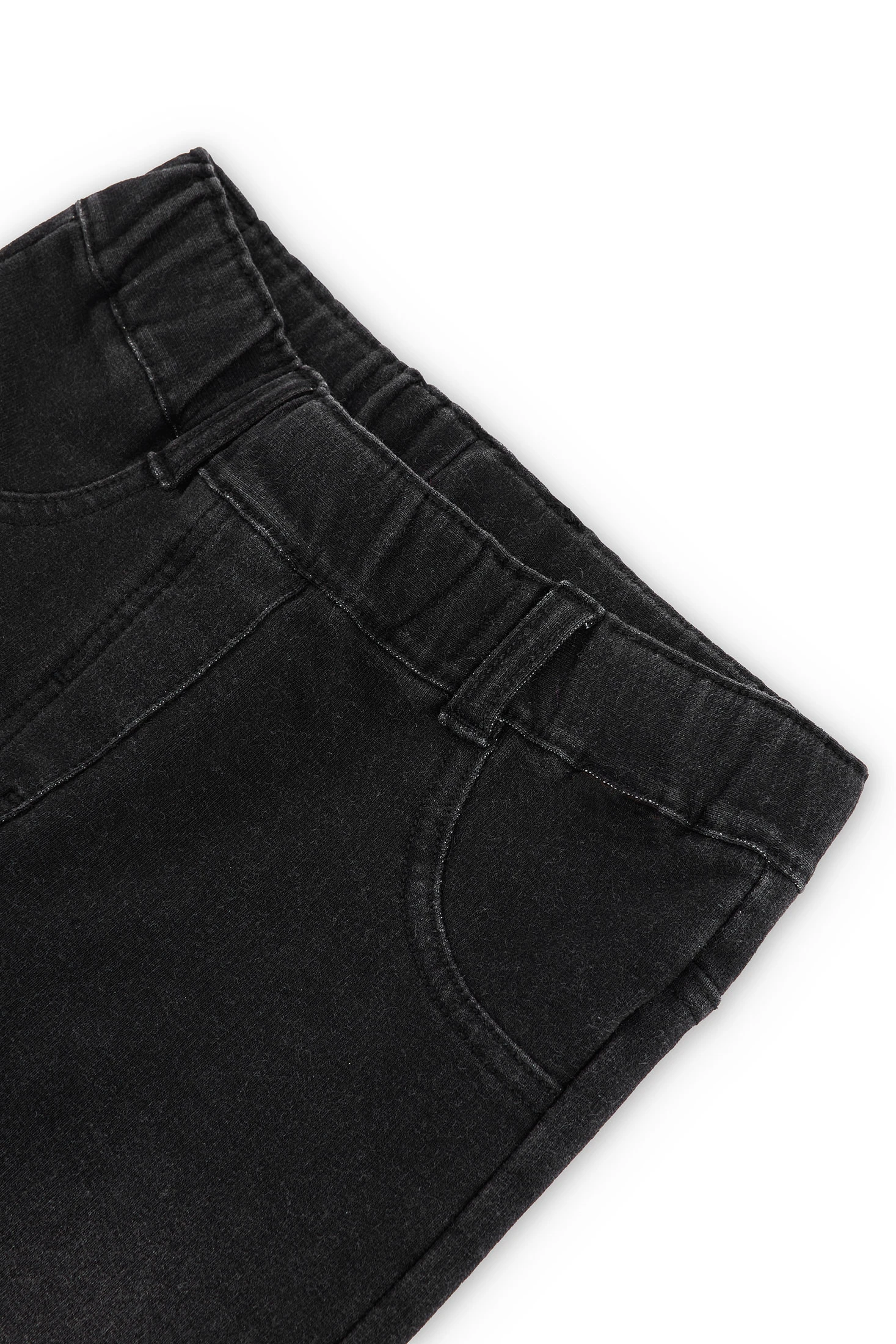 This is a girl's denim fleece trouser, suitable for in-between seasons. It comes in a solid black colour, made from knit fabric. The design is plain, offering a simple yet stylish look. It's available in various sizes, ranging from 4 months to 16 years. This trouser is perfect for everyday wear, providing both comfort and durability. It's easy to pair with any top, making it a versatile addition to your child's wardrobe. Ideal for both indoor and outdoor activities. This denim fleece trouser is a practical and fashionable choice for your little girl.