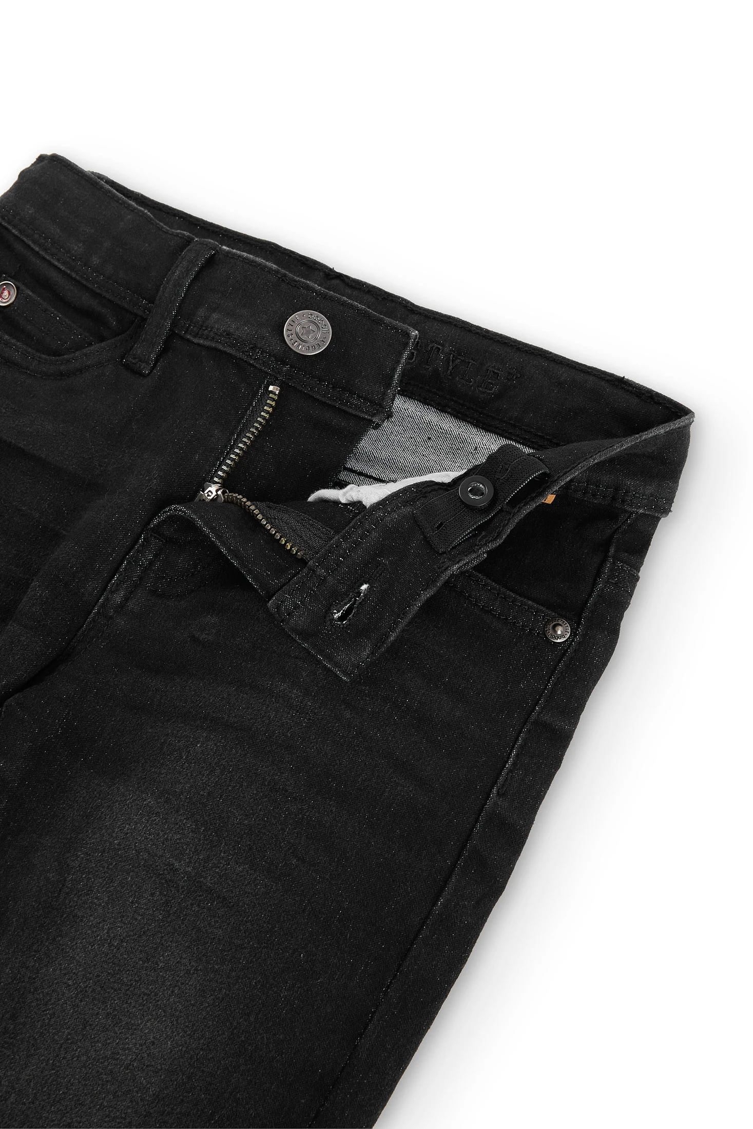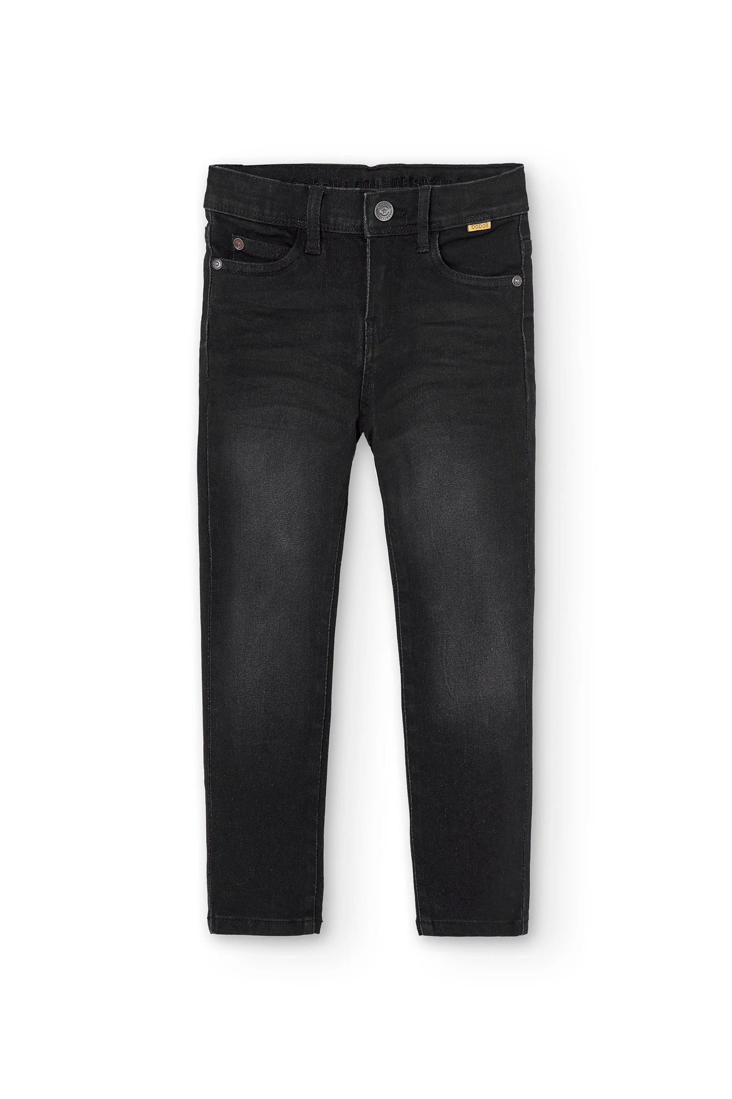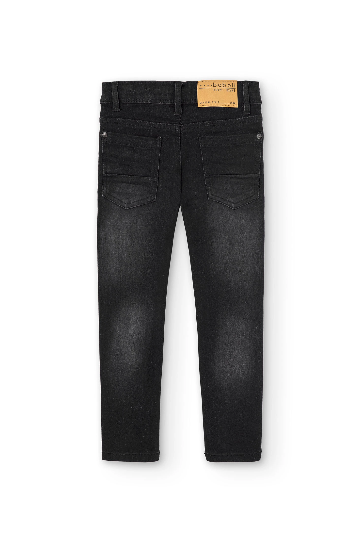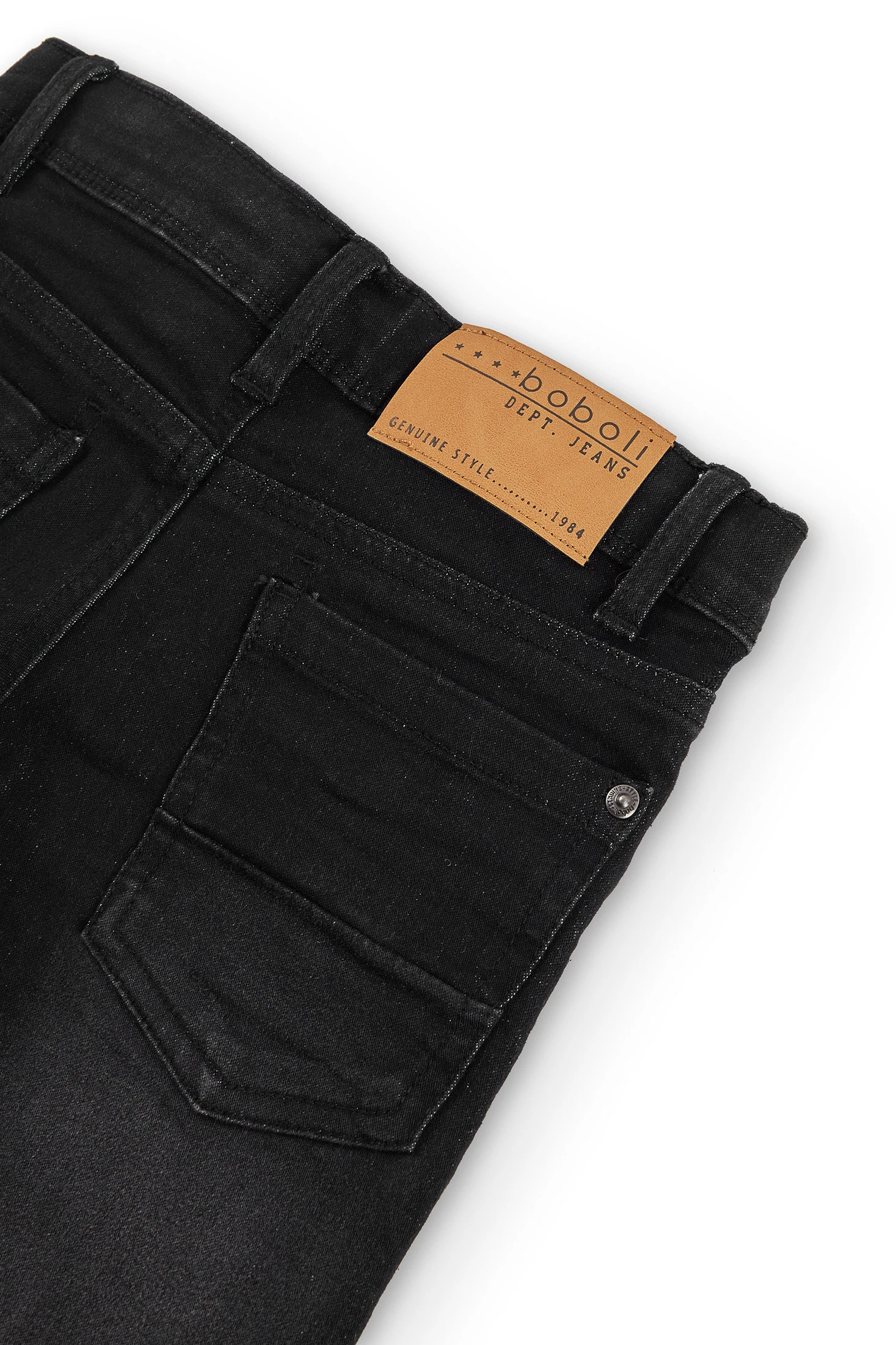 This is a child's stretch denim trouser, perfect for in-between seasons. It comes in a solid, sleek black colour, adding a touch of style to any outfit. The fabric is flat, ensuring comfort and ease of movement. It's available in sizes ranging from 4 months to 16 years, making it a versatile choice for growing kids. The trousers feature a button closure, providing a secure fit. This is a simple yet fashionable piece, ideal for everyday wear or special occasions. It's a must-have addition to any child's wardrobe.