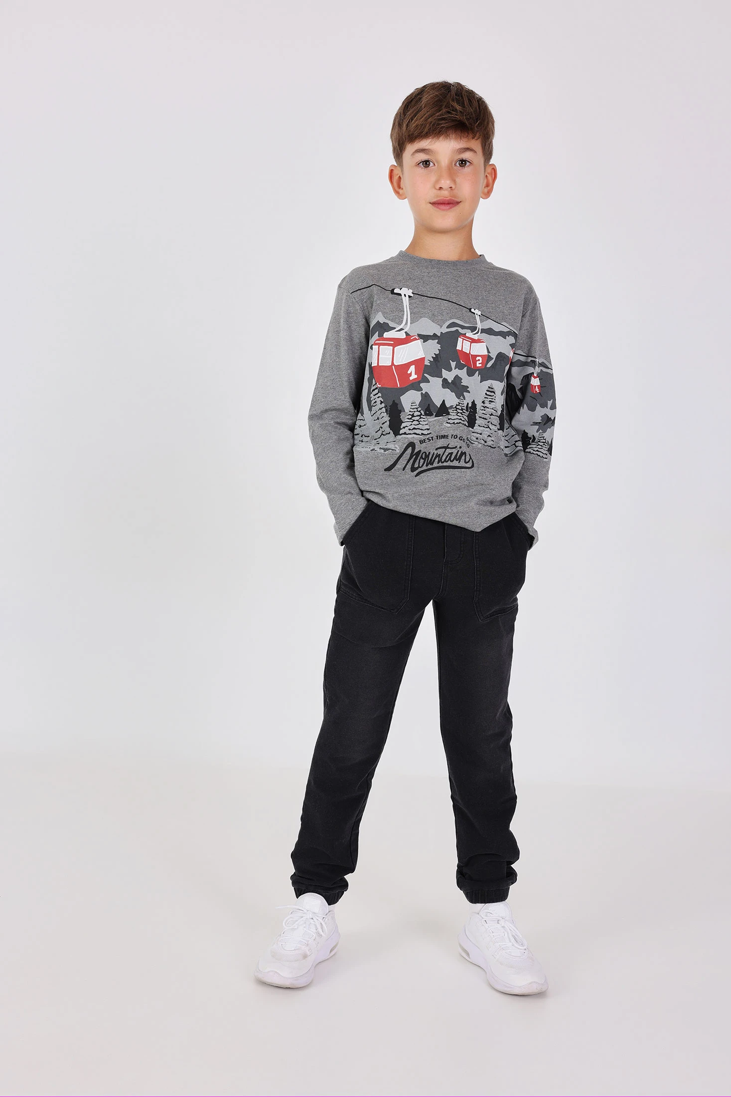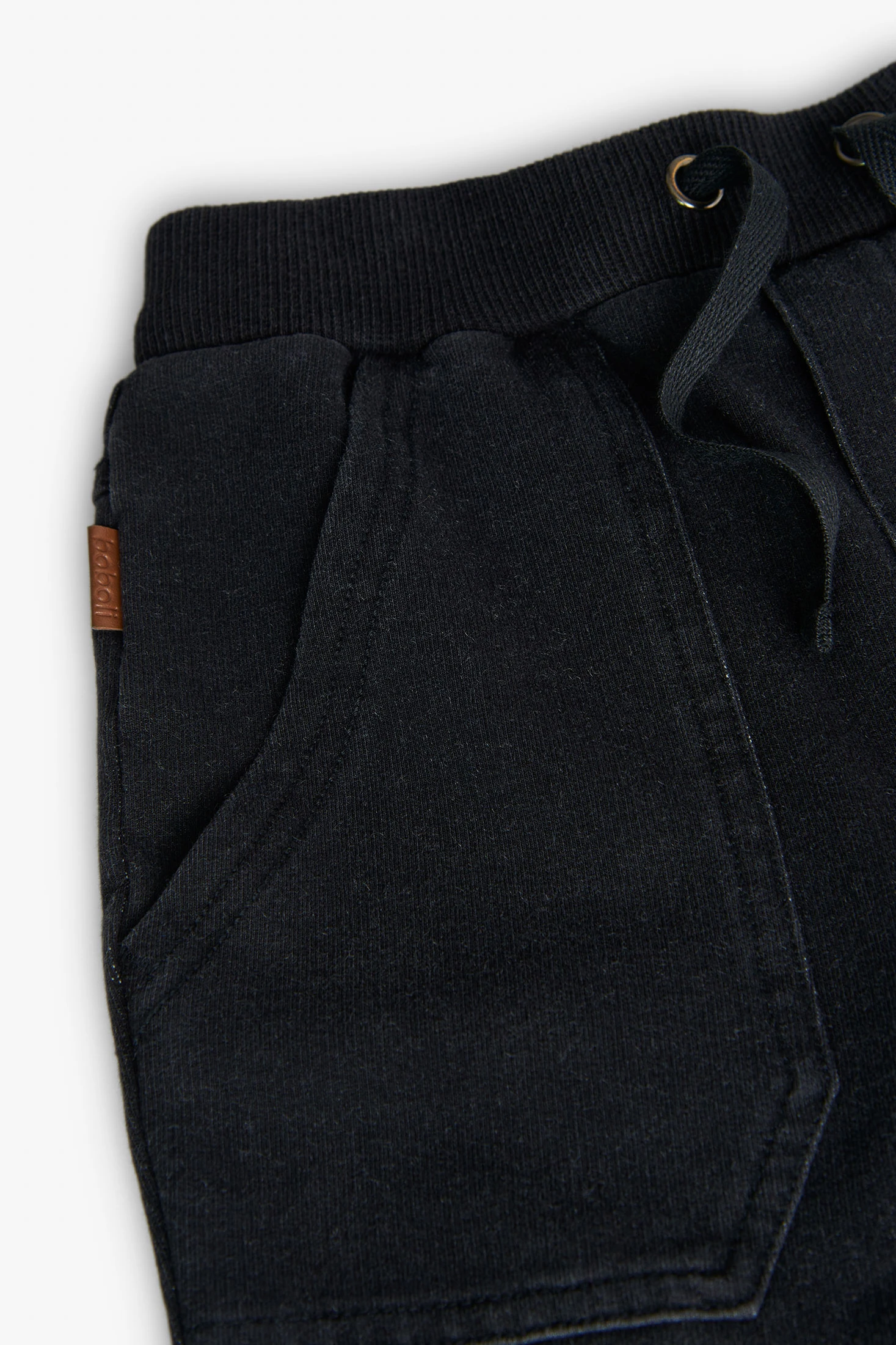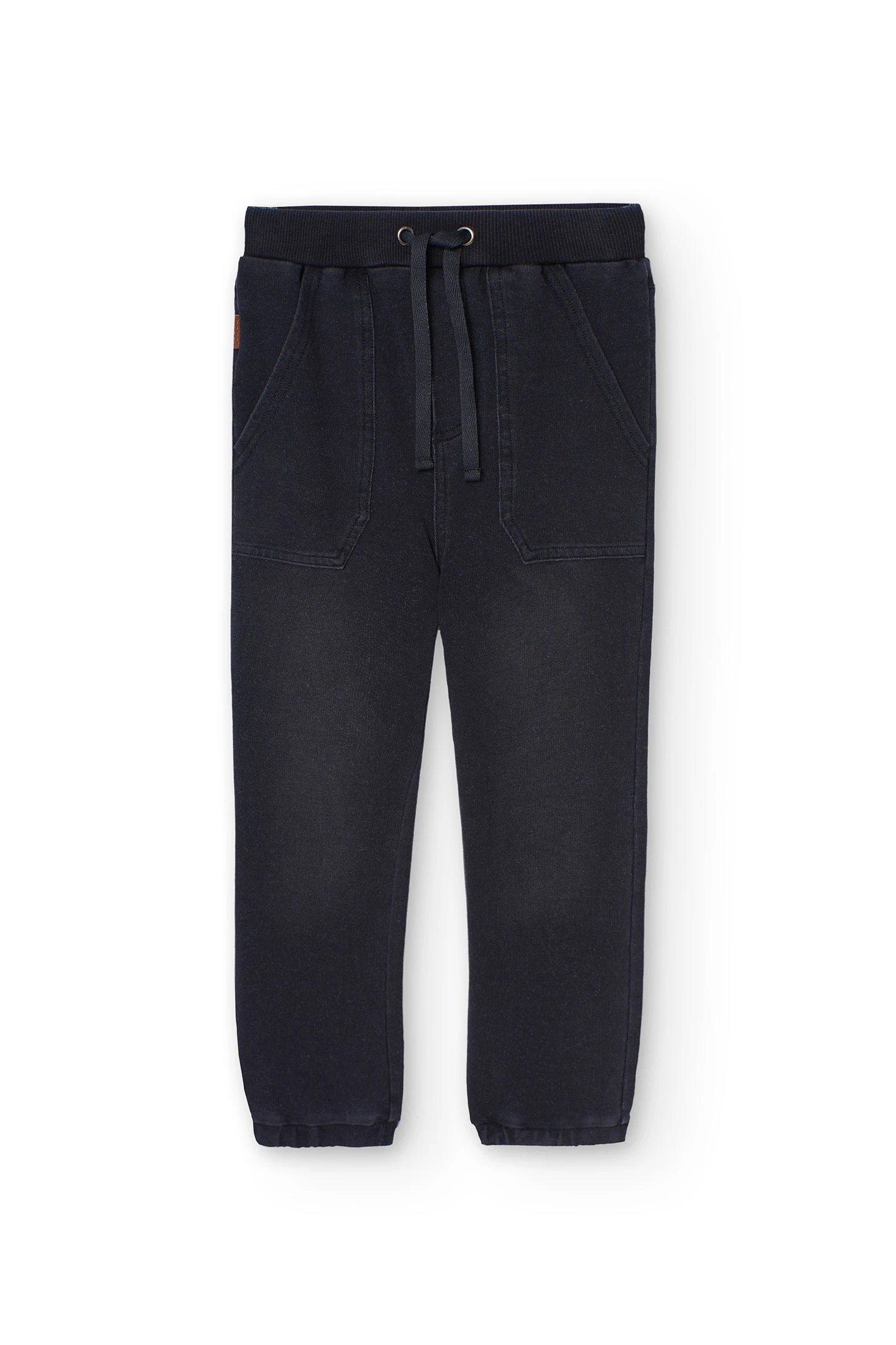This is a plain, black denim fleece trouser for boys. Suitable for in-between seasons, it's made from knitted fabric, ensuring comfort and durability. Available in sizes ranging from 4 months to 16 years, it's designed to grow with your child. The trousers are undecorated, offering a simple and versatile style that can be paired with any top. Ideal for everyday wear, these trousers are a practical addition to any boy's wardrobe. Please note, this product does not feature any brand names or promotional offers.