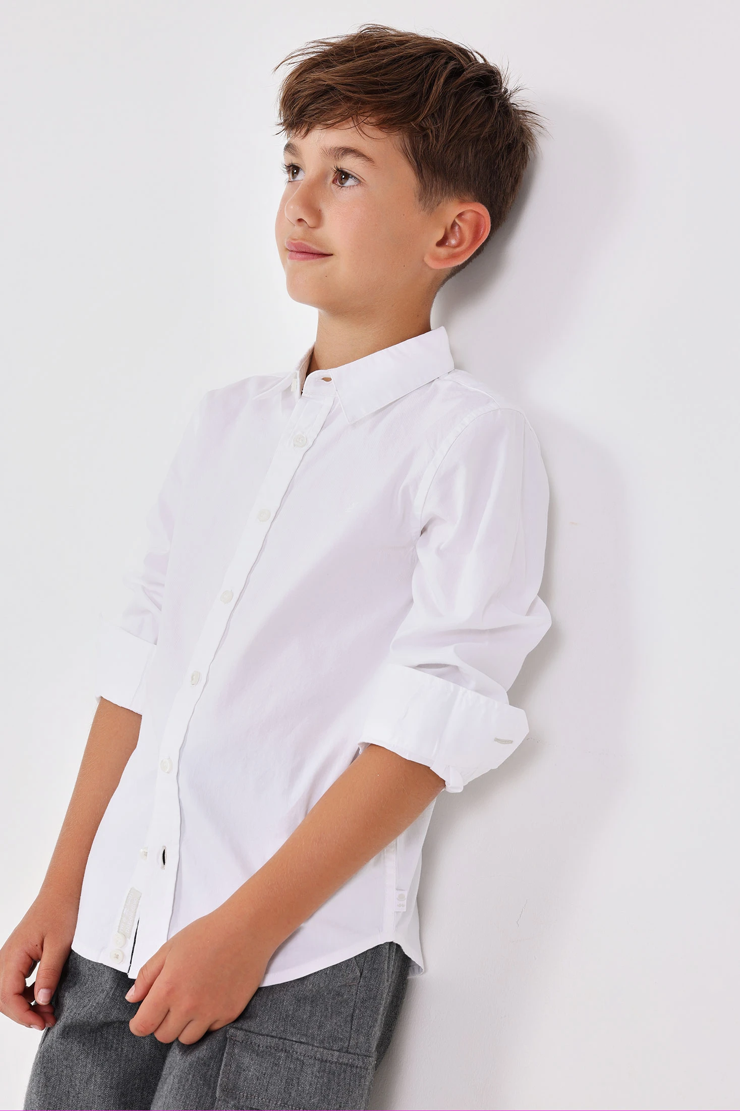 This is a boy's oxford shirt in an attractive white colour, ideal for the spring and summer season. The soft and lightweight fabric provides all day comfort. The shirt features a cute little pineapple print, adding a fun touch to the design. It has a classic collar and button-down cut, making it suitable for both casual and dressier occasions. It is available in a range of sizes for boys from 4 to 16 years old, and is a great choice for pairing with shorts or chinos, ensuring a cool and stylish look.