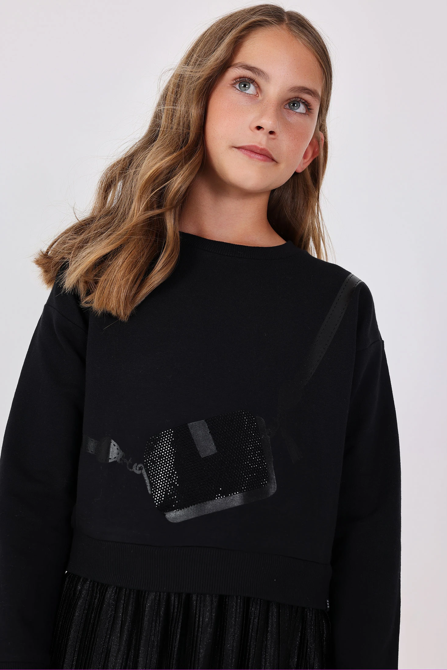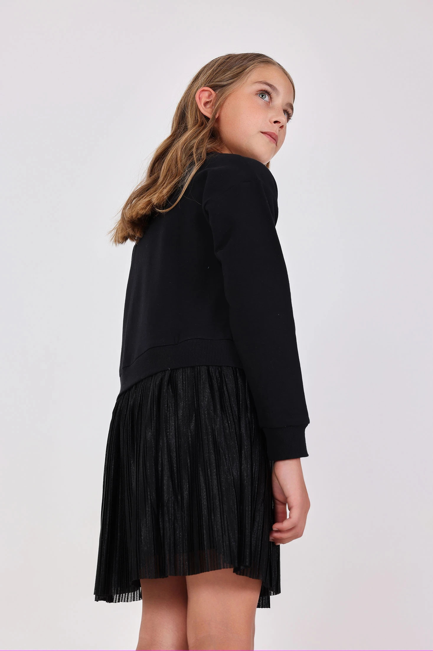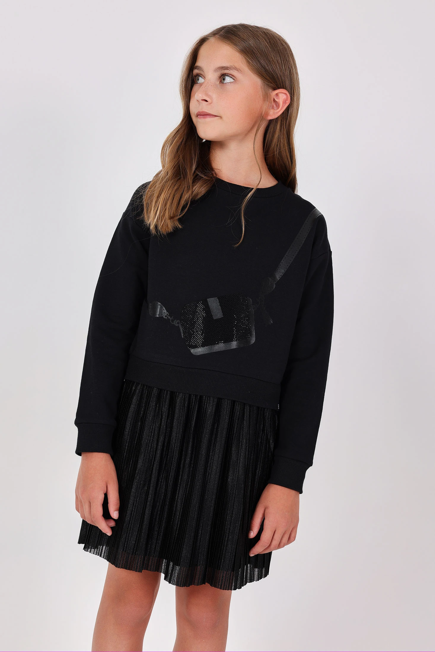 Fleece dress in combined black for girls, perfect for the autumn and winter seasons, combining comfort and style. Made from fleece fabric, it ensures warmth and softness on the chilliest days. Its design with two textures and the detail of a bag simulating sequins add a chic and contemporary touch. It features a round neck and long sleeves, suitable for special occasions or everyday wear. Available in sizes ranging from 2 to 14 years, it's a versatile garment that can be easily paired with shiny accessories to highlight its elegance.