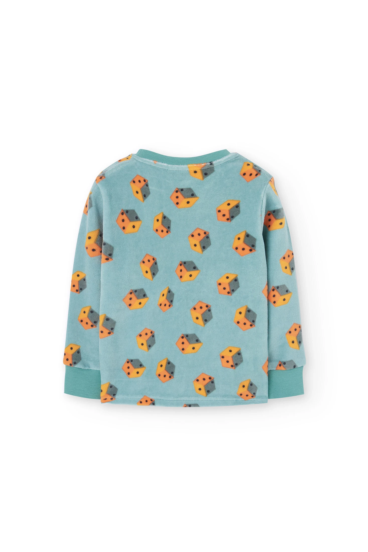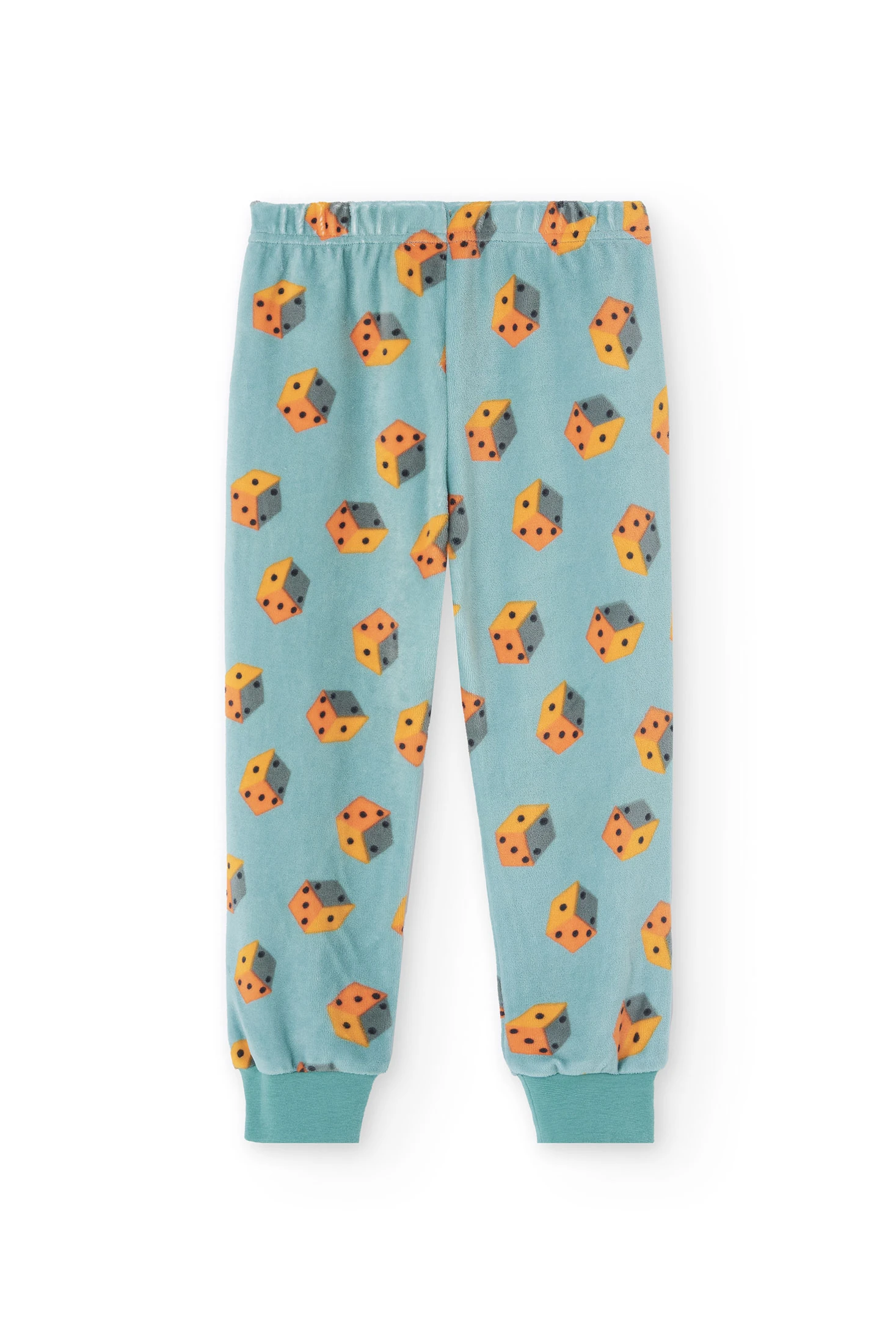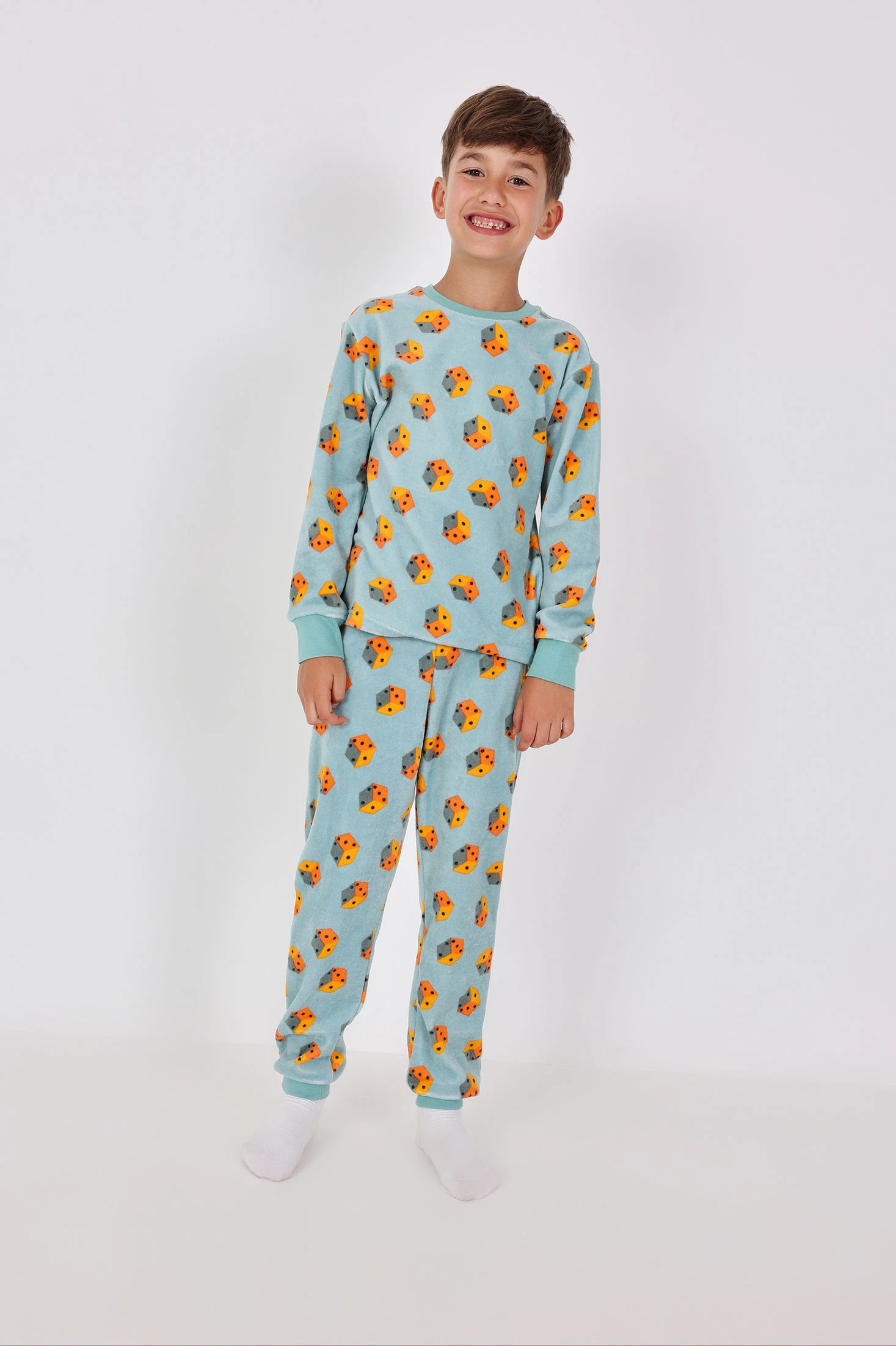 Knitted pyjamas for boys in green with a dice print, ideal for autumn and winter nights. Made from a soft knit fabric that ensures comfort and freedom of movement, it features long sleeves and trousers to ensure warmth during rest. Available in sizes from 2 to 14 years, it offers a fun and cosy option for children to sleep peacefully and stylishly.