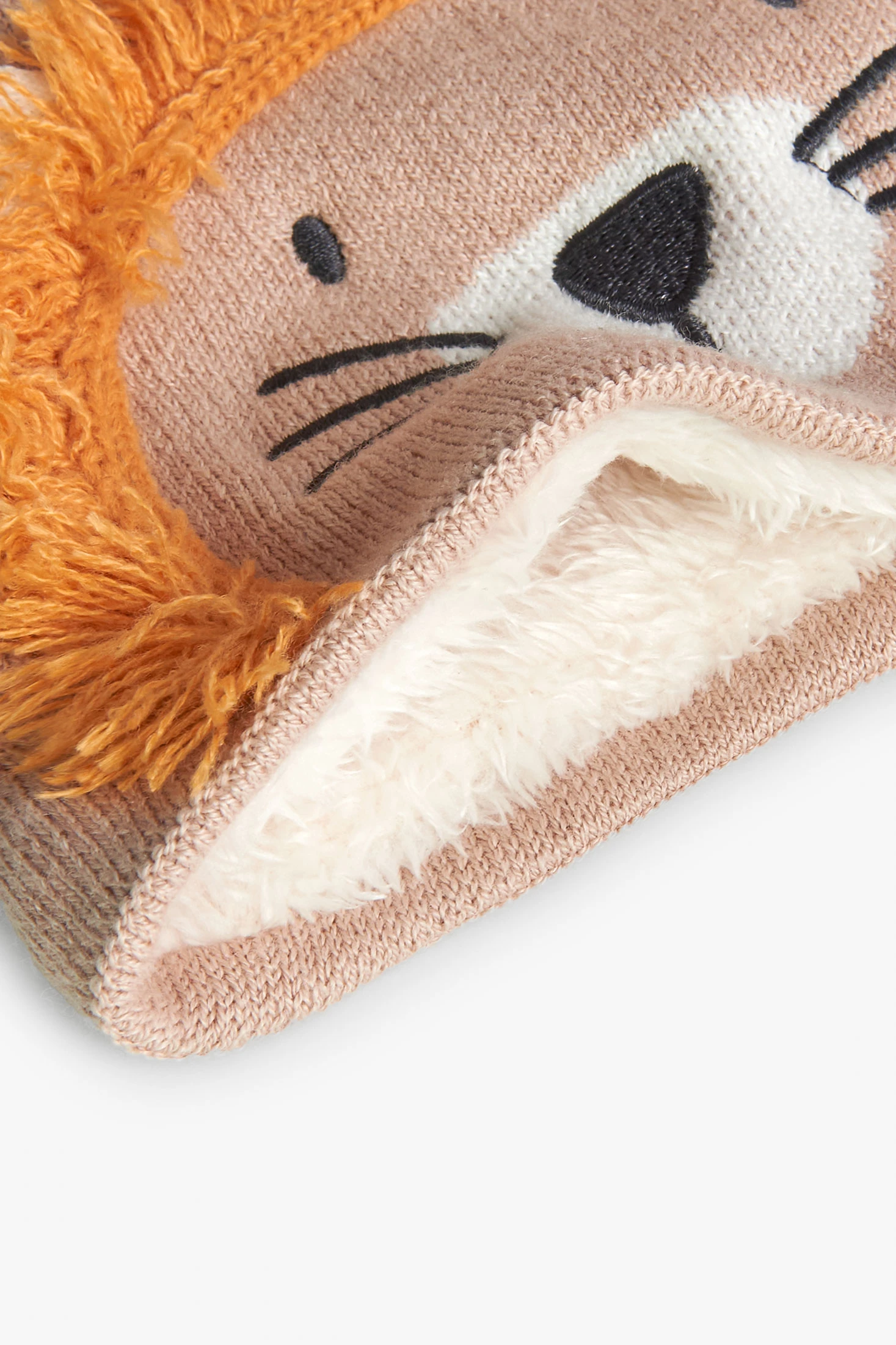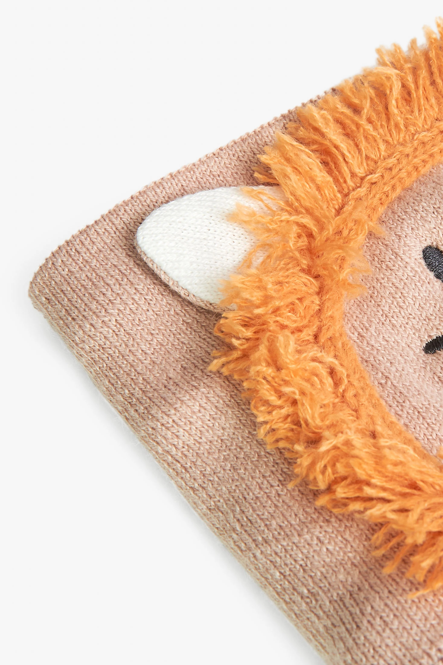This is a knitted scarf with a lion design for babies, ideal for newborns. It is unisex and comes in sizes XXS, XS, S, and M, perfect for babies from months to years old. The scarf is made of knitted fabric, making it soft and comfortable for the baby's delicate skin. Its decoration adds a fun and adorable touch. It is beige in colour, a neutral tone that matches any outfit. This scarf is ideal for the winter season, keeping your baby warm and stylish.